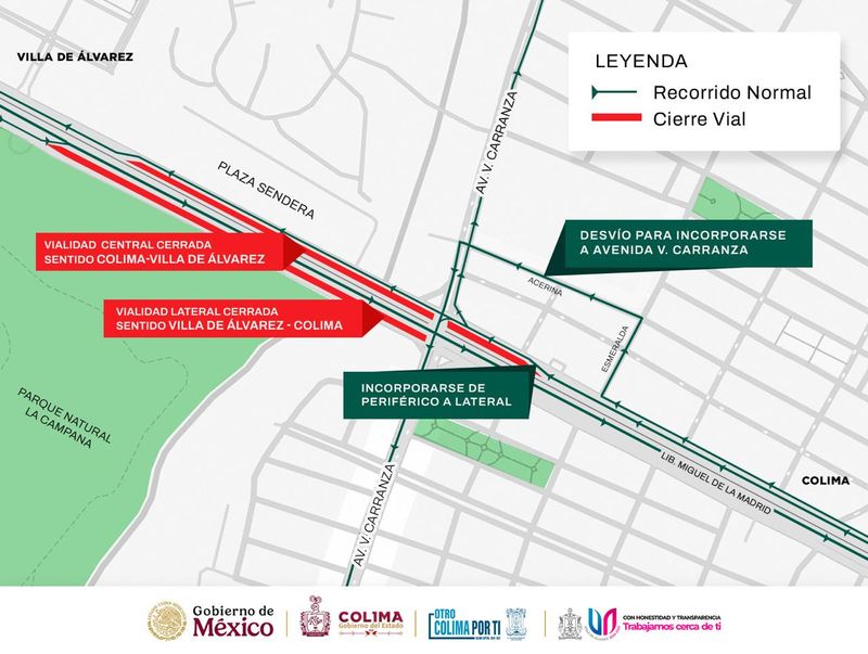 El Gobierno del Estado de Colima informa que, desde este miércoles 9 de julio, se inhabilitarán los carriles centrales del Tercer Anillo Periférico, en el sentido Colima–Villa de Álvarez, como parte de los trabajos preliminares para la construcción del paso superior vehicular Arco Norte, a la altura de la avenida Venustiano Carranza. El tramo intervenido va de la calle Esmeralda hasta Plaza Sendera, sin afectar el cruce con dicha avenida.