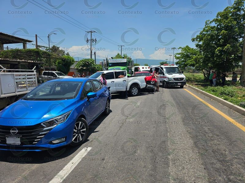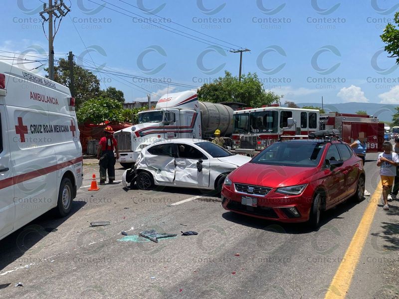 Cuatro personas resultaron lesionadas y se registraron cuantiosos daños materiales tras una carambola ocasionada por un tractocamión que impactó al menos cinco vehículos en la autopista Armería–Tecomán.