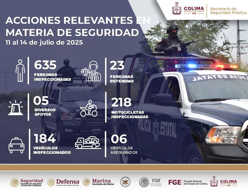 La Secretaría de Seguridad Pública (SSP) del Gobierno del Estado de Colima informa que, durante el fin de semana, elementos de la Policía Estatal Preventiva (PEP), con apoyo de personal operativo de la Secretaría de Marina, realizaron la detención de 23 personas en distintos hechos ocurridos en la entidad, por su probable participación en delitos contra la salud, robo equiparado y diversas faltas administrativas.