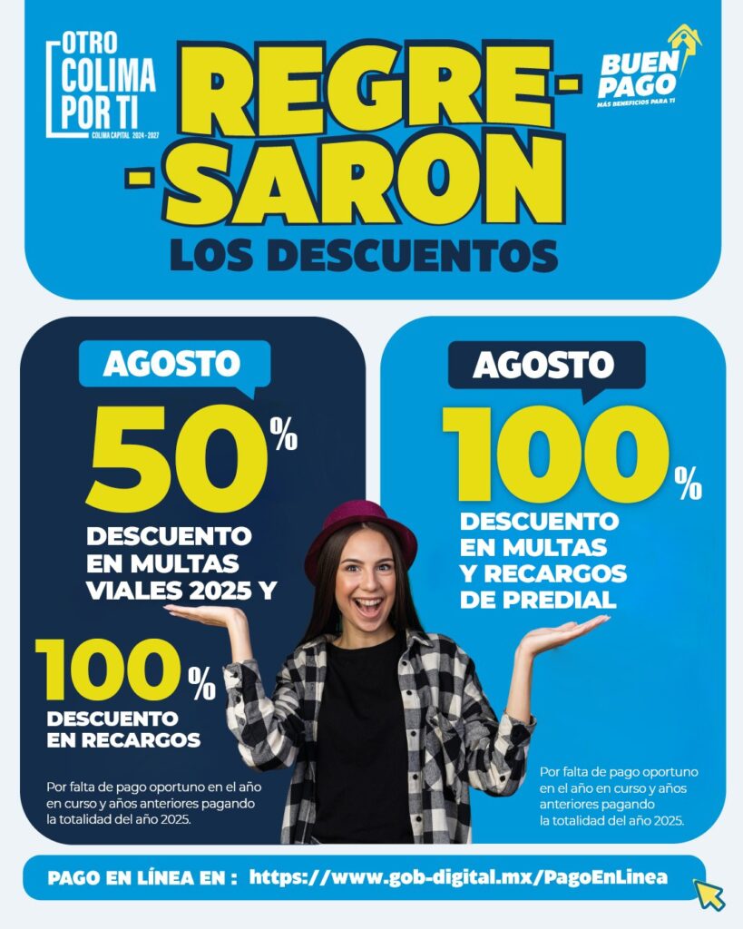 El Ayuntamiento de Colima invita a la ciudadanía a aprovechar los estímulos fiscales vigentes del 1 de agosto al 30 de septiembre, que contemplan la condonación del 100% en recargos y multas por falta de pago del impuesto predial, así como de los recargos en multas viales. El beneficio busca apoyar la economía de las familias y fomentar la regularización de adeudos.