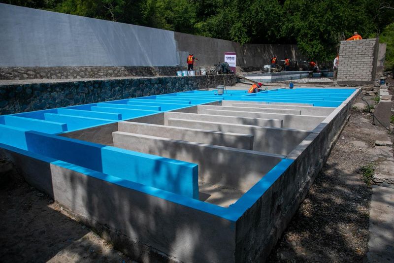 Las acciones que se están realizando en el lugar son suministro y colocación de 260.50 metros de tubería de PVC corrugada de 8 pulgadas de diámetro, así como la limpieza de estructura y canales desarenadores; construcción de área de secado de lodos (pretratamiento), rehabilitación de serpentín de cloración, construcción de caseta de cloración, construcción de muro perimetral, construcción de emisor de descarga y limpieza general del área de trabajo.