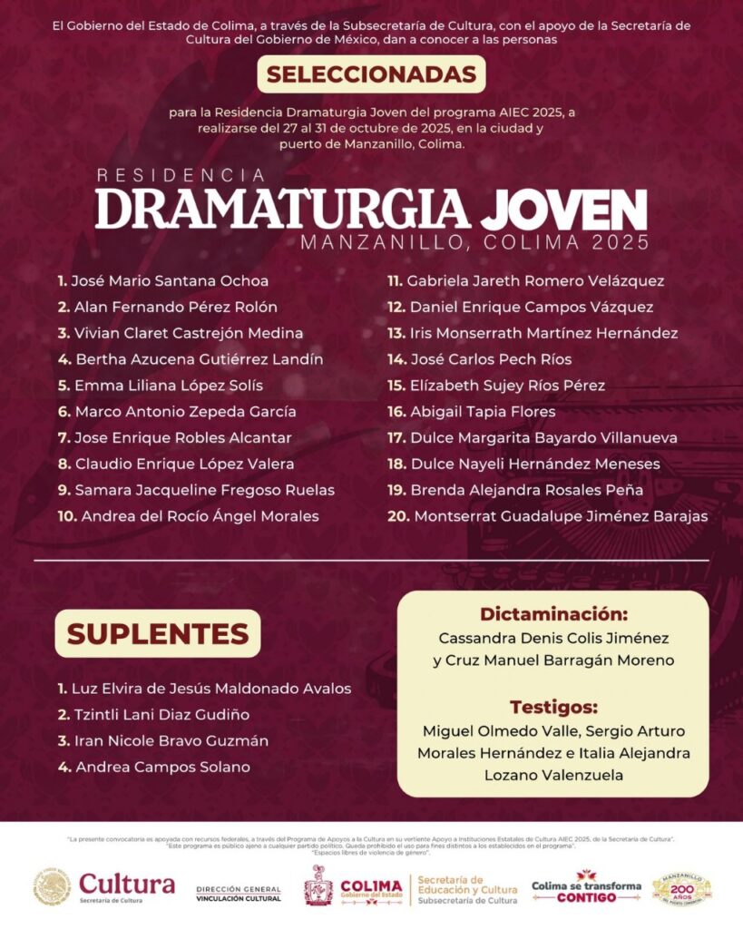 La Subsecretaría de Cultura del Gobierno del Estado de Colima, en coordinación con la Secretaría de Cultura del Gobierno de México, a través del programa federal de Apoyos a Instituciones Estatales de Cultura, publicaron la lista de personas seleccionados para integrar la Residencia en Dramaturgia Joven Manzanillo 2025, que se llevará a cabo del 27 al 31 de octubre del presente año.