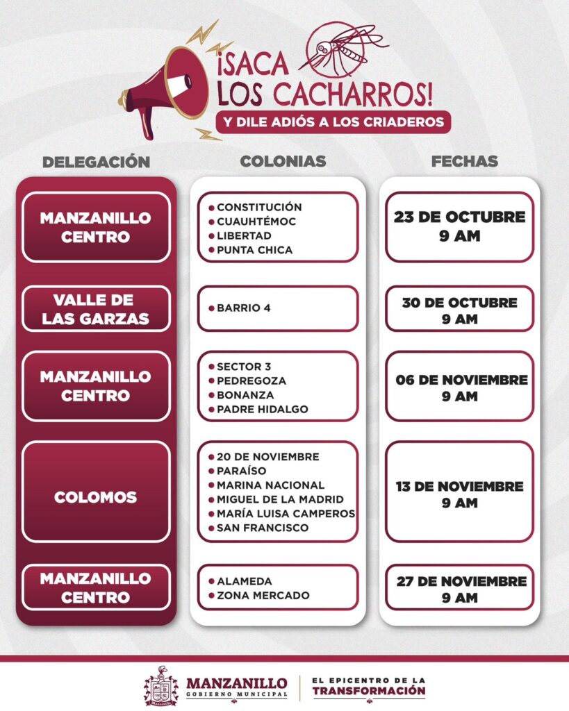 Con el objetivo de eliminar posibles criaderos de mosquitos y prevenir enfermedades como el dengue, chikungunya y zika, el Gobierno de Manzanillo, a través de la Dirección de Bienestar y Salud Comunitaria, llevará a cabo la jornada de descacharrización “Saca a los cacharros y dile adiós a los criaderos”.