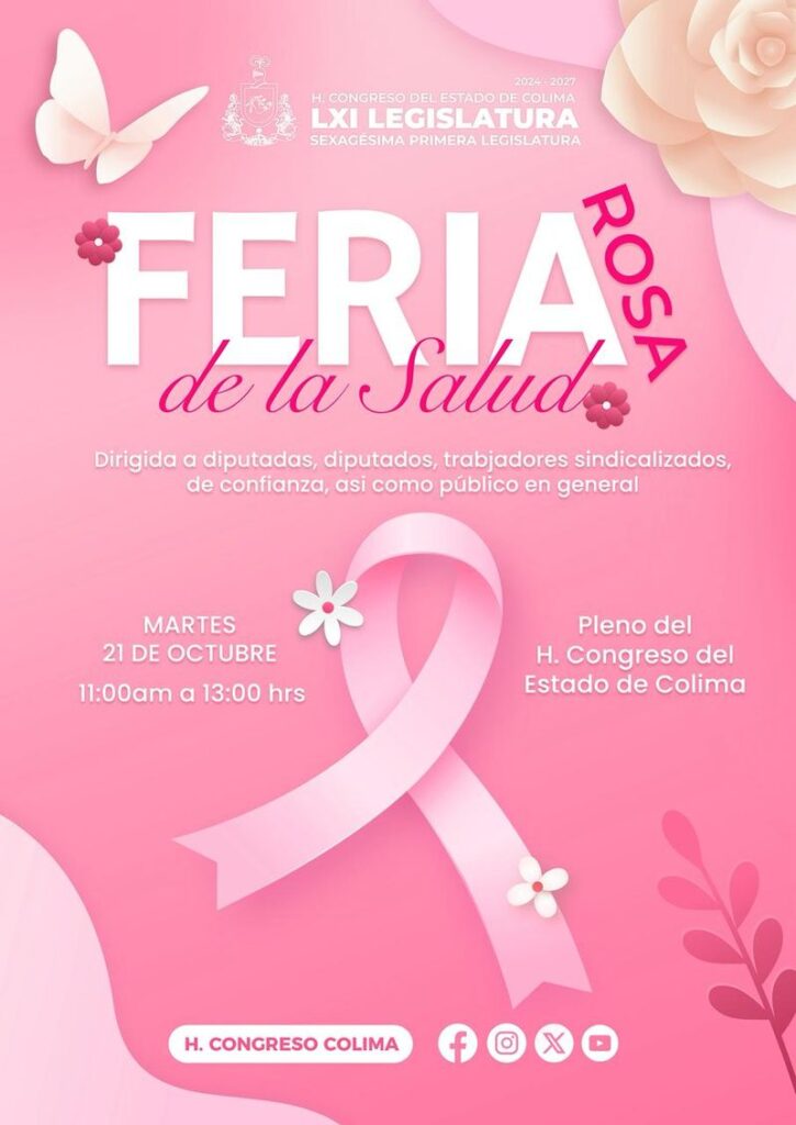 En el marco del Mes de Sensibilización Sobre el Cáncer de Mama, este martes 21 de octubre, en el H. Congreso del Estado de Colima, se realizará la “Feria Rosa de la Salud”, con la que se busca visibilizar, sensibilizar, promover y crear conciencia sobre la detección, diagnóstico y tratamiento oportuno del cáncer de mama.