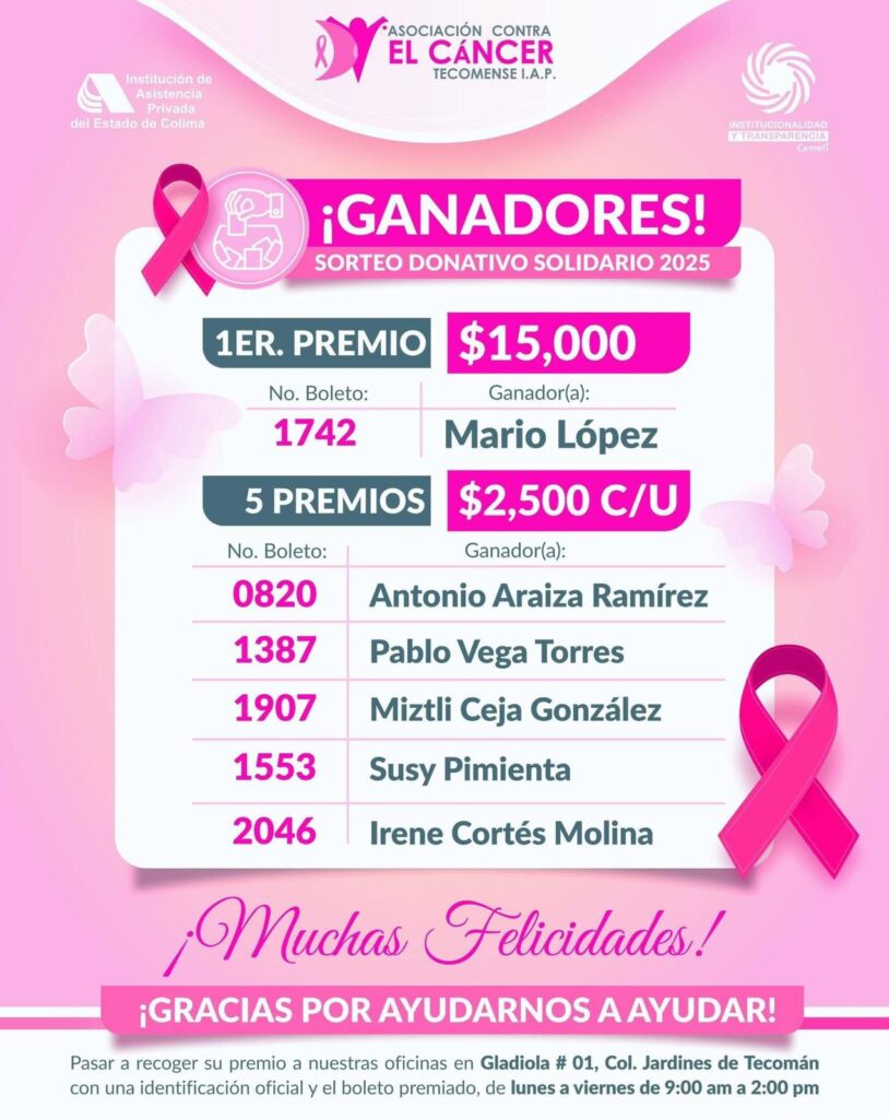Este viernes 31 de octubre se realizó el Sorteo Solidario 2025 de la Asociación Contra el Cáncer Tecomense IAP, evento con el que concluyeron las actividades de “Octubre Rosa”, mes dedicado a la lucha contra el cáncer de mama y cérvico uterino.
